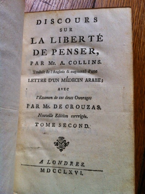 Collins « Libertés de penser » 1766 en 2 vol in-12 en maroquin d’époque.Ce livre a comme but « de ne point donner une aveugle crédulité à ces mystères qu’on ne saurait trop approfondir » lit-on dans l’avertissement.