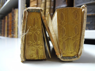 Aucune trace de cuir sur le dos : celui-ci est constitué d’une tranche de papier doré, identique à la tête, à la queue et à la gouttière. L’ouvrage présente ainsi quatre tranches de papier, au lieu des trois habituellement observées.