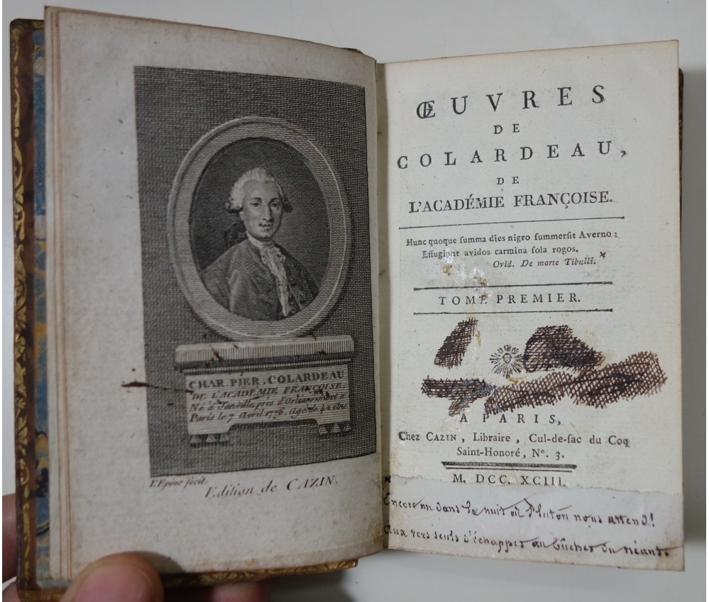 C’est à Drouot que tout a commencé. Une vente banale, un mercredi d’automne, l’une de ces dispersions où l’on fourre indistinctement de la porcelaine fêlée, quelques bronzes de pacotille, des bibelots poussiéreux, et, à la fin du catalogue, un maigre lot de livres anciens. Personne n’y prête attention : ni les marchands d’art qui lorgnent sur les toiles, ni les jeunes commissaires trop pressés de liquider les invendus. Mais mon œil, lui, s’est arrêté sur une ligne que nul n’avait jugée digne d’intérêt : « Colardeau, Œuvres, Paris, Cazin, 1793, 3 vol. in-18. Reliure de l’époque. Au titre du tome I, note manuscrite : dernier livre de Cazin. Tache brune en marge. »