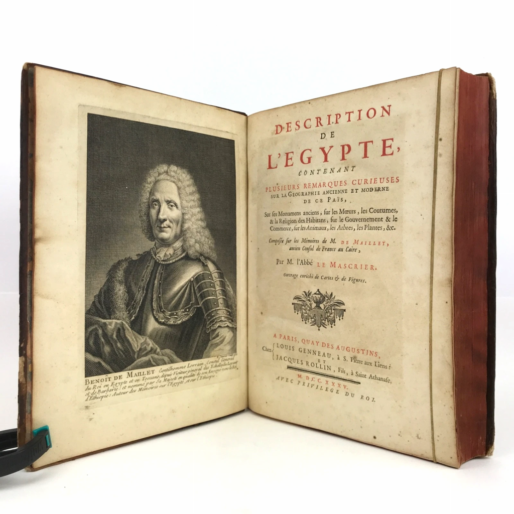 Le Mascrier, 1735, description de l’Égypte. Mention « Éd. originale » et gravures.