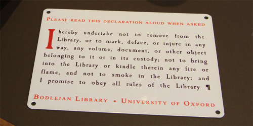 « I hereby undertake not to remove, deface, or injure in any way, any volume, document, or other object belonging to it or in its custody; not to bring into the Library, or kindle therein, any fire or flame; and not to smoke in the Library. And I promise to obey all rules of the Library.”