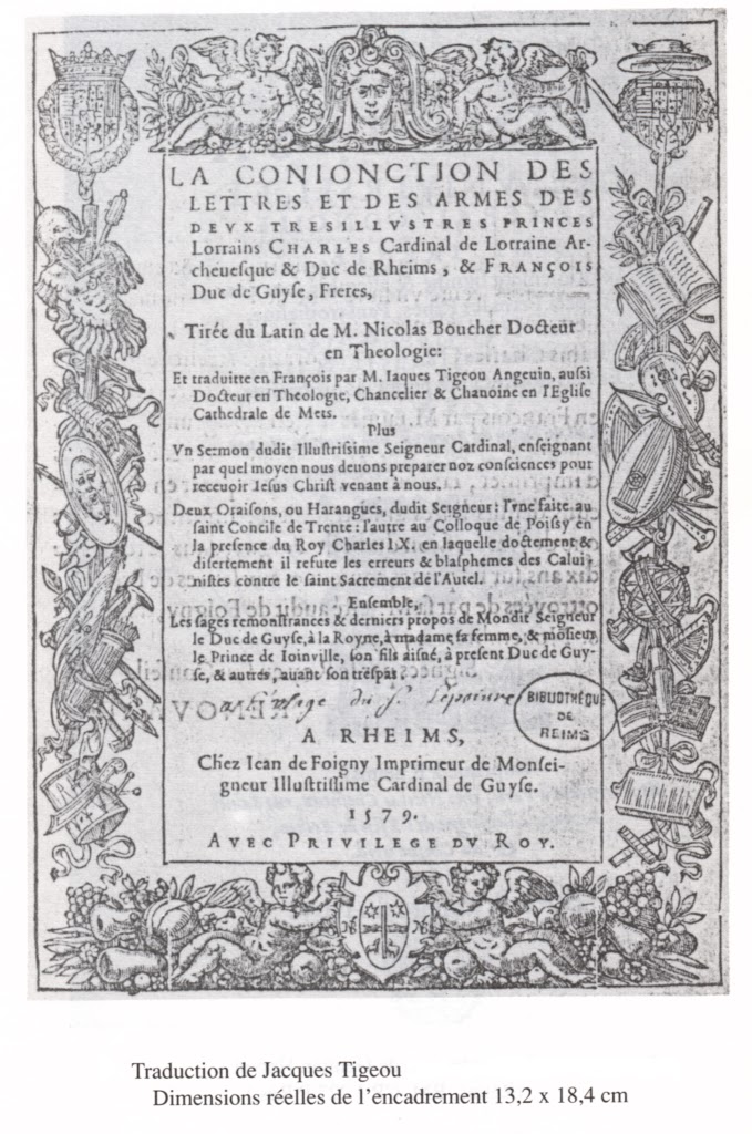 L’encadrement gravé sur bois de la page de titre et du feuillet 133, et le portrait gravé sur cuivre du cardinal de Lorraine, entre les feuillets 127 et 128, de La Conjonction des lettres et des armes de 1579, proviennent du matériel de l’imprimeur parisien Fédéric [sic] Morel, originaire de Troyes et décédé en 1583.